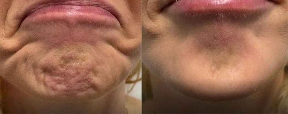 The skin on the chin will begin to appear smoother within 5–7 days. By the 2-week mark, the "orange peel" texture will be fully softened, and the chin will appear more relaxed and defined.