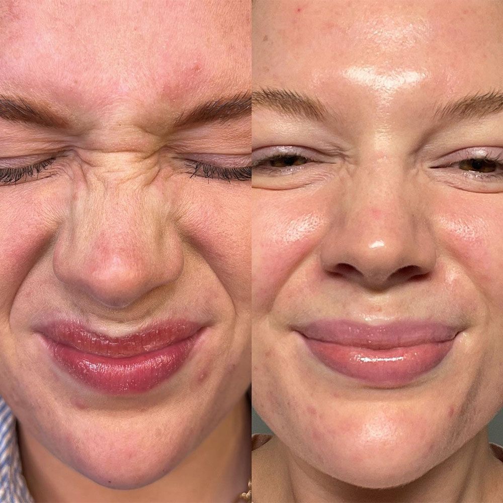 When the nasalis muscle is hyperactive, it can cause the nose to appear wider or create "bunny lines" along the bridge. By relaxing this muscle, we reduce the outward pull and tension, which smooths the skin and creates a more narrowed, slender appearance of the nasal bridge.